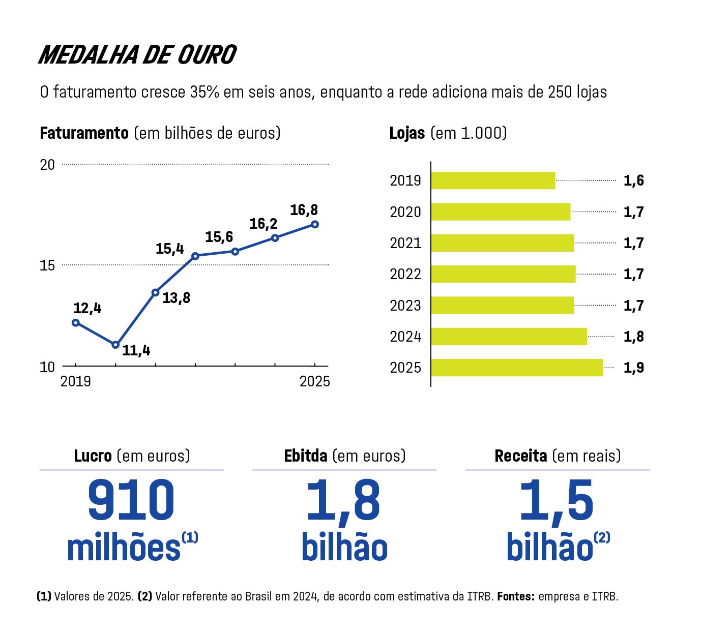 Chegar ao topo não fez a Decathlon descansar. Mesmo num cenário desafiador para empresas globais — tarifas em alta, guerras comerciais e consumidores mais cautelosos com os gastos —, a varejista francesa continua crescendo. Só em 2025, o lucro subiu 16%, para 910 milhões de euros, e o Ebitda fechou em 1,8 bilhão de euros, alta de 21% em relação ao ano anterior. A receita subiu 4%.