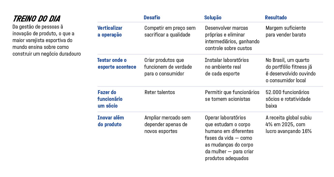 Em abril de 2001, desembarcou no Brasil, com uma loja em Campinas, no interior de São Paulo, instalada num terreno de 50.000 metros quadrados com quadras e parque ao ar livre. Hoje, são 102.000 funcionários em mais de 80 países. “Além de sermos a maior varejista de artigos esportivos do mundo, somos uma das três maiores marcas de esporte do mundo, atrás apenas da Nike e da Adidas”, diz Oliver Pedro José, chefe global de comunicação da companhia. Tudo isso com uma parte significativa da cadeia operando dentro de casa.