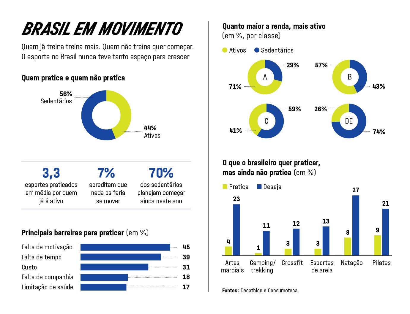 O grupo ativo — 44% da população adulta — pratica, em média, 3,3 esportes diferentes e treina o dobro do mínimo recomendado pela Organização Mundial da Saúde. Além disso, mais da metade das pessoas aumentaram a frequência de treinos no último ano, e 75% trocariam um programa de lazer badalado numa sexta-feira por um treino no sábado. “No ranking de práticas esportivas, o futebol, o vôlei e o basquete até podem estar consolidados”, diz Amir Somoggi, sócio-diretor da Sports Value, uma consultoria especializada em negócios esportivos. “Mas, a cada novo hype ou prática esportiva, a Decathlon está posicionada para receber o consumidor. Porque vai ter produto lá.”