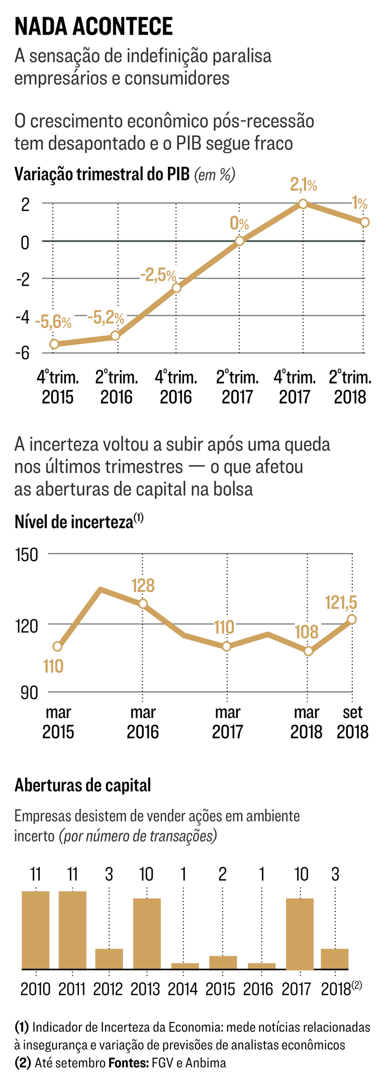 A retomada da atividade econômica tem deixado a desejar desde 2016. Depois de ter encolhido 8,2% ao longo de 11 trimestres, o produto interno bruto só avançou 2,5% nos últimos seis trimestres. Em maio deste ano, a greve dos caminhoneiros jogou um balde de água fria na incipiente retomada. De lá para cá, o acirramento dos ânimos na política fez com que as empresas pisassem mais fundo no freio, suspendendo planos e projetos até que as perspectivas fiquem mais claras. O que se vê agora é uma economia semiparalisada, à espera da definição do ocupante futuro do Palácio do Planalto: Jair Bolsonaro ou Fernando Haddad (PT).
