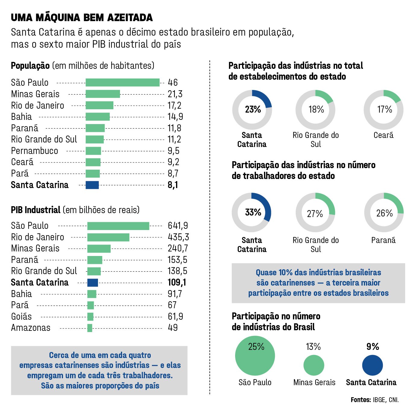 Os resultados colocam Santa Catarina no topo do ranking nacional. Segundo a Fiesc, em 2021 o estado liderou o ICI, superando estados como São Paulo, Rio Grande do Sul e Paraná. Santa Catarina apresenta o maior valor adicionado da manufatura per capita do Brasil, estimado em 1.736 dólares por habitante (base 2015), além de exportações industriais per capita acima da média nacional. Em 2021, a indústria respondeu por 27,5% do Valor Adicionado Bruto (VAB) estadual, com a manufatura concentrando cerca de 78% desse total — a segunda maior participação industrial do país, atrás apenas do Amazonas, cuja estrutura é fortemente influenciada pela Zona Franca de Manaus.
