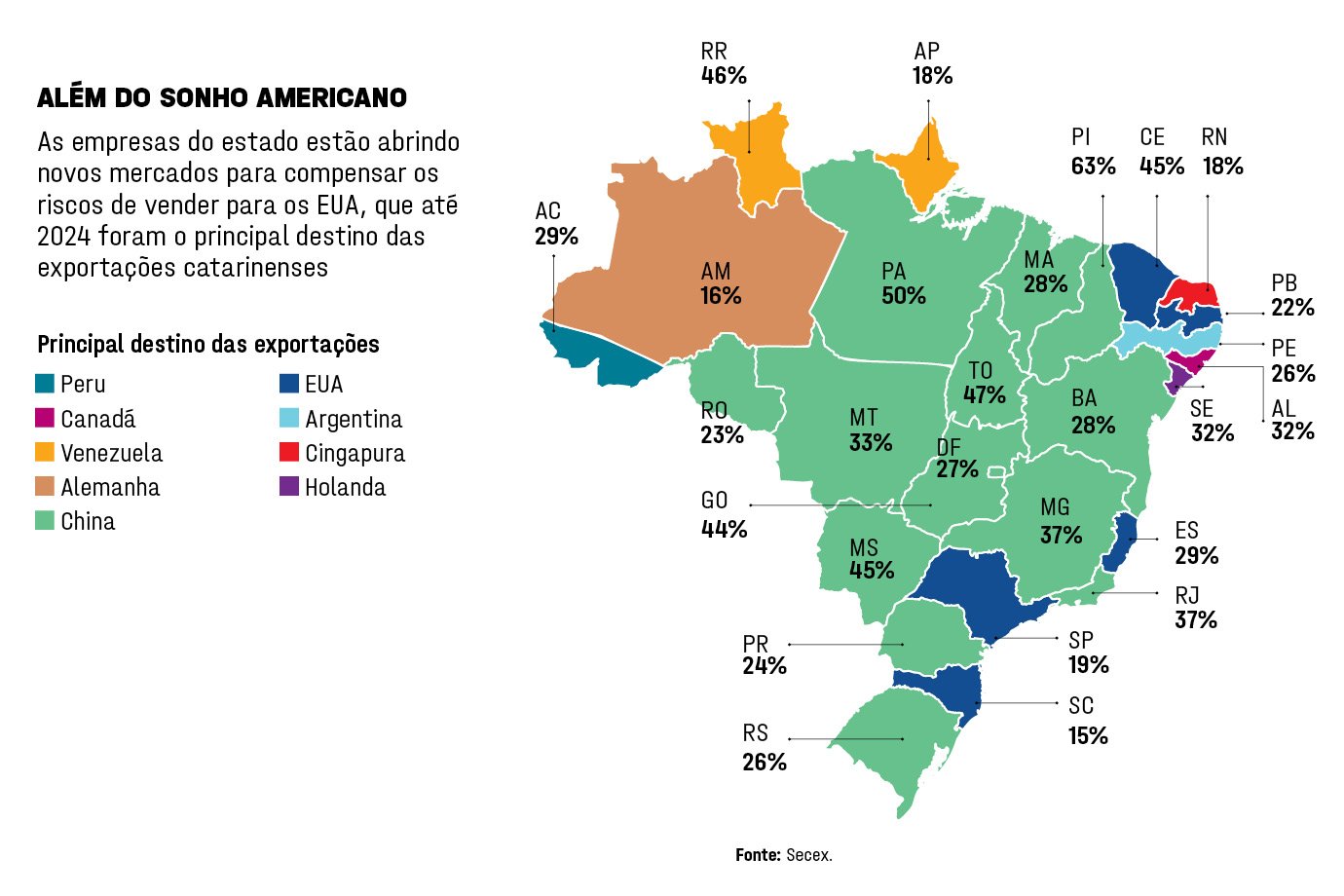 O tarifaço aplicado pelos Estados Unidos aos produtos brasileiros foi um duro golpe à indústria catarinense em 2025, que tem no mercado americano seu principal parceiro comercial — diferentemente de outros estados brasileiros, cuja economia é fortemente sustentada pelas commodities e que têm na China o principal destino de suas exportações. “A indústria catarinense sofreu com as tarifas, mas continua forte”, diz Bittencourt, da Fiesc. Segundo ele, economias regionais diversificadas como a catarinense tendem a se recuperar rapidamente das crises. “Se houve um lado bom no tarifaço, foi o de fazer muitas empresas catarinenses irem em busca de novos mercados, e os resultados gradativamente começam a aparecer”, diz Bittencourt.
