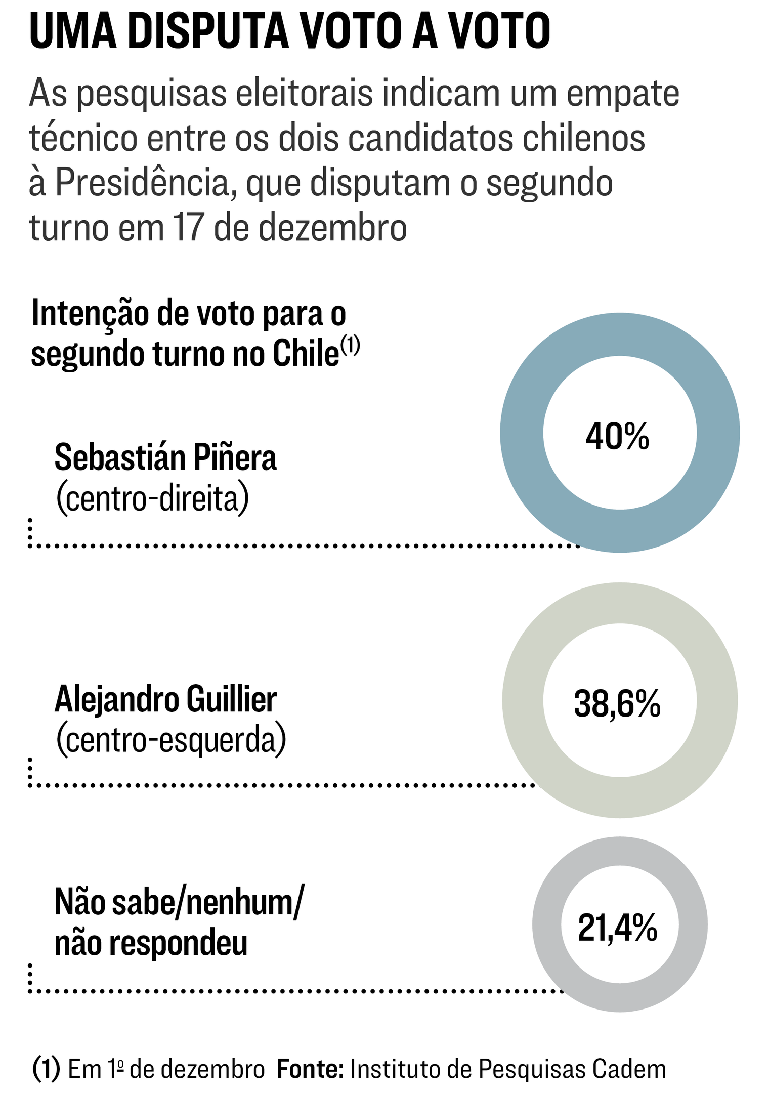O Brasil e o Chile vivem momentos distintos na discussão sobre a reforma da Previdência. Enquanto o governo Temer ainda tenta convencer deputados e senadores da urgência de estancar o enorme déficit no sistema previdenciário, os chilenos já estão numa terceira etapa da reforma e agora debatem como aumentar o valor das aposentadorias sem desorganizar sua ajustadíssima economia. O tema está no topo da agenda dos dois candidatos à Presidência, Sebastián Piñera, de centro-direita, e Alejandro Guillier, de centro-esquerda. Eles se enfrentam no segundo turno das eleições no dia 17, numa das disputas eleitorais mais acirradas desde a redemocratização. Os dois estão tecnicamente empatados. Piñera, que governou o país de 2010 a 2014, tem 40% das intenções de voto, e Guillier, 38,6%.