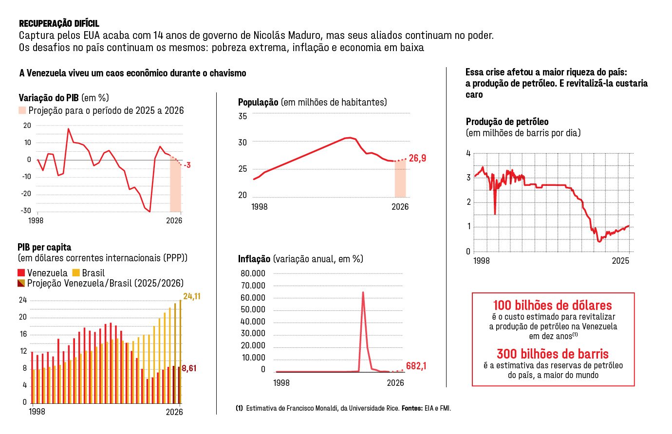 Apesar da vasta riqueza, a produção do país caiu mais de 65%, para pouco mais de 1 milhão de barris diários de 1998 a 2025, segundo a EIA, agência de energia dos EUA. Houve um aumento nos últimos anos, é verdade (veja o quadro acima). Mas os custos para revitalizar a pujança seria de 100 bilhões de dólares nos próximos dez anos, nas contas de Francisco Monaldi, da Universidade Rice, nos EUA.