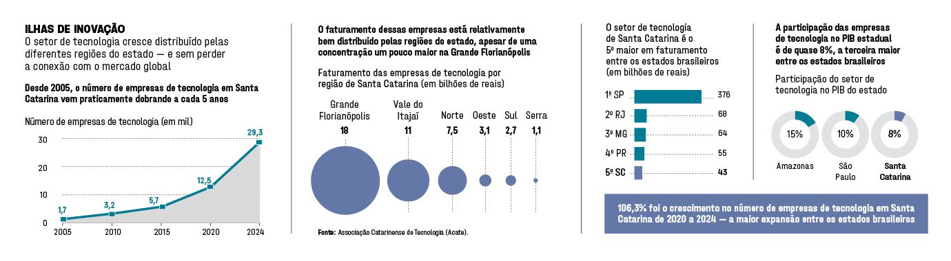 Mais importante do que o tamanho do setor de tecnologia catarinense é a sua composição: muitas empresas médias, altamente especializadas, com foco em eficiência, exportação de serviços e integração com grandes cadeias produtivas.