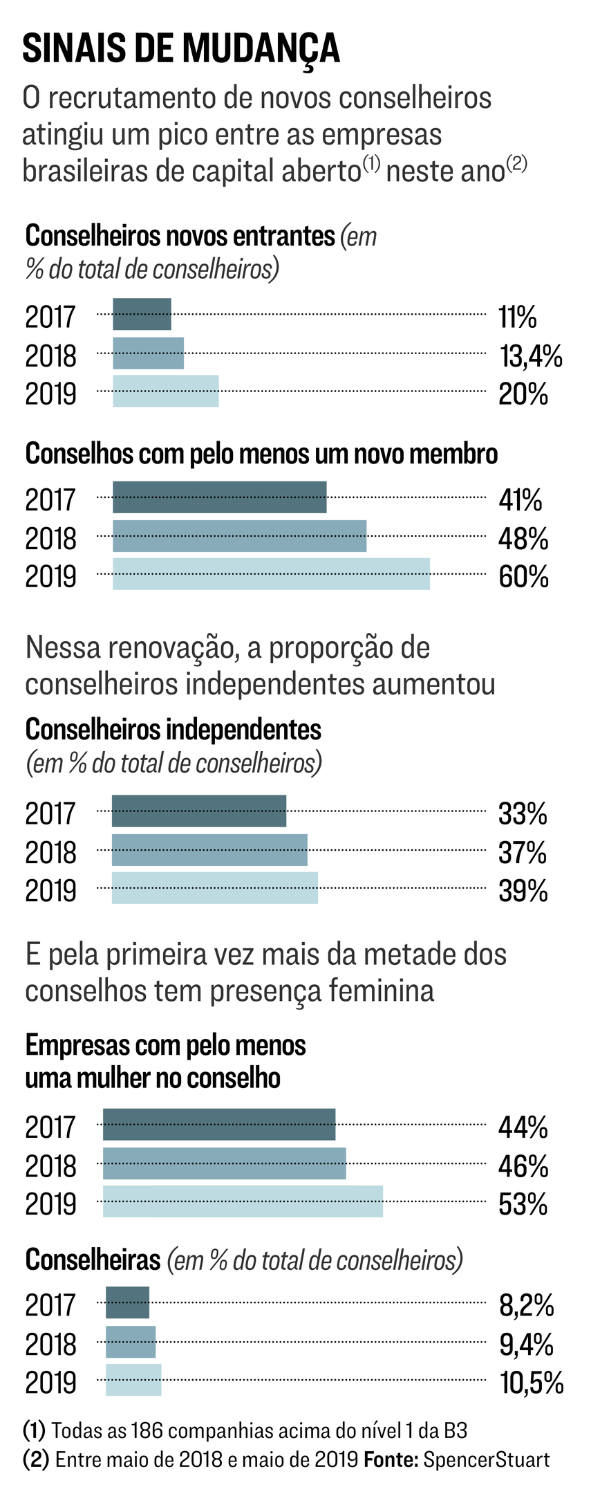 A análise considera as 186 empresas listadas nos níveis 1 e 2 e no Novo Mercado, este último o mais alto nível de governança da bolsa brasileira. Entre elas, 60% contrataram pelo menos um novo integrante para o conselho no período de maio de 2018 a maio de 2019. O movimento resultou na troca do ocupante de 20% dos quase 1.600 assentos disponíveis nessas empresas. Em anos anteriores, a taxa de renovação girava em torno de 10% (veja quadro abaixo). “Mais e mais empresas se veem diante da necessidade de trazer para o conselho de administração competências diferentes, o que resulta na busca por gente nova”, diz Fernando Carneiro, sócio da SpencerStuart e responsável pelo levantamento.