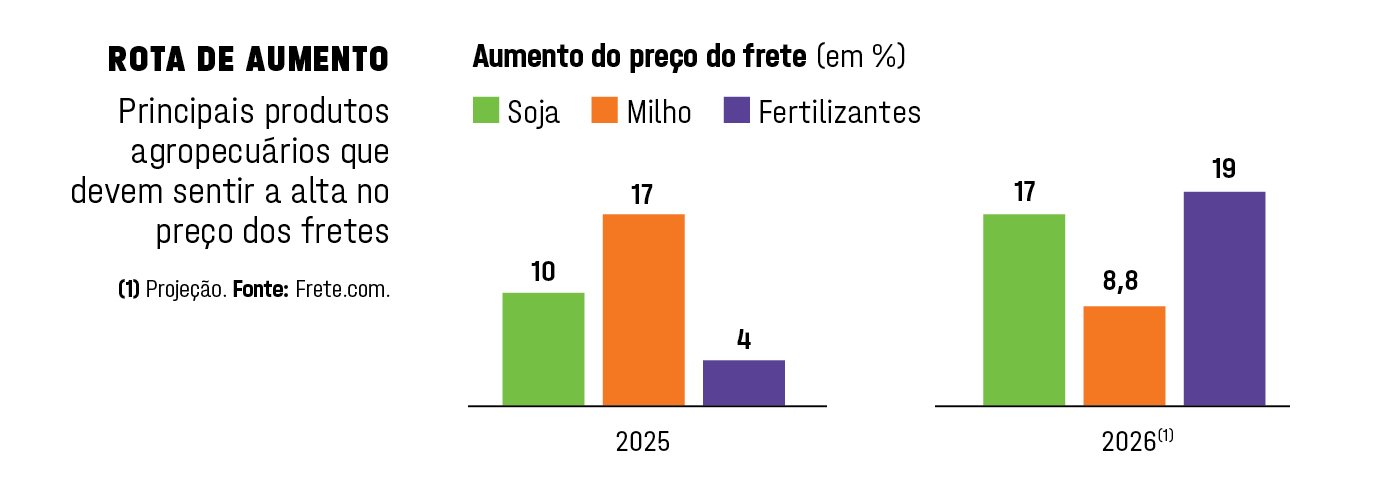 A combinação entre uma nova supersafra e o reforço na fiscalização da Agência Nacional de Transportes Terrestres (ANTT) tende a elevar os custos logísticos ao longo do ano. Estimativas da Frete.com, plataforma que conecta empresas a caminhoneiros autônomos, apontam aumentos de 17,1% no frete da soja, 8,8% no de milho e 19,1% no de fertilizantes.