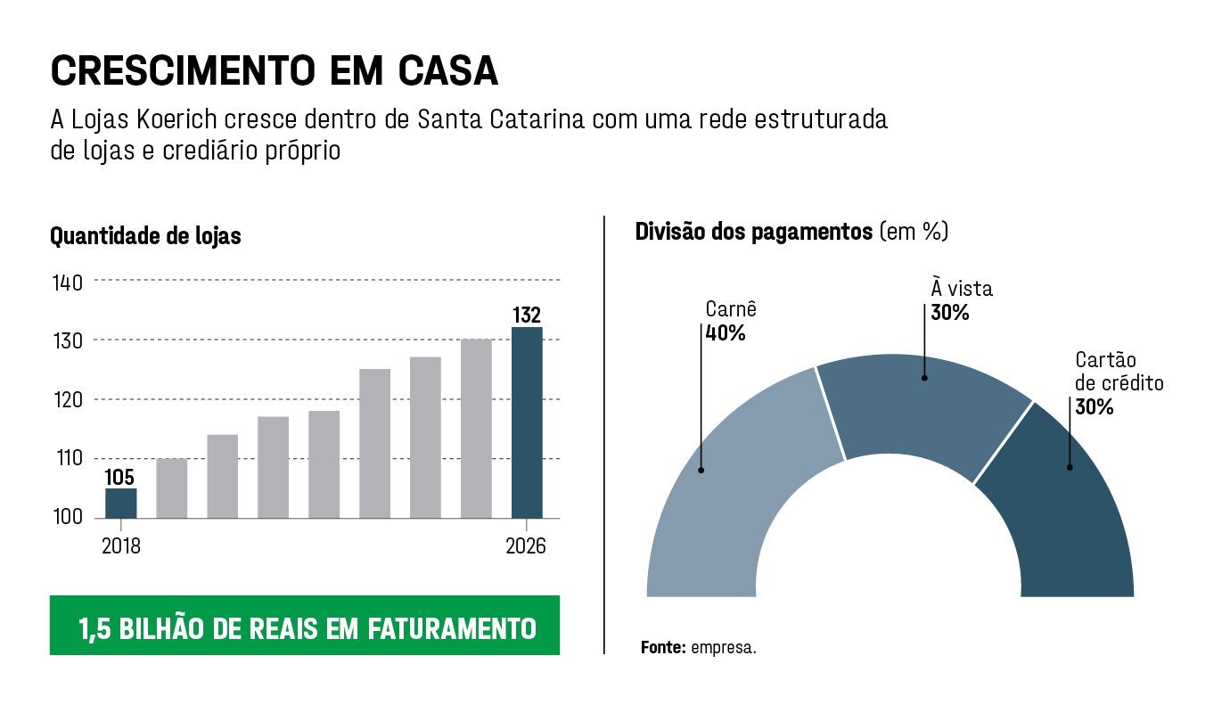 A bem da verdade, Rafael Koerich nem precisaria ter ido a Nova York ou passado por uma experiência frustrante numa loja americana para chegar a essa conclusão. A ideia de o varejo se sustentar no básico bem-feito o acompanha desde criança, quando ouvia o pai e o avô repetirem essa máxima nas conversas à mesa de jantar. Rafael é da quarta geração da família por trás da Lojas Koerich, um gigante regional de eletromóveis com mais de 130 lojas espalhadas por Santa Catarina e faturamento na casa de 1,5 bilhão de reais. Ao levar ao limite a tese da proximidade com o cliente, a empresa se tornou um dos melhores exemplos de um fenômeno peculiar do Brasil: redes regionais que continuam crescendo, mesmo na era do e-commerce e dos grandes marketplaces.