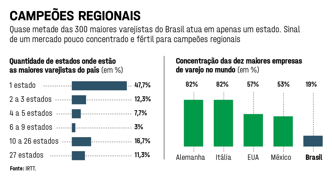Hoje, das 300 maiores empresas do varejo no Brasil, praticamente metade atua apenas em um estado, de acordo com o levantamento do instituto Retail Think Tank Brasil. “Somente 34 das maiores varejistas estão em todos os estados da federação e, mesmo assim, muito concentradas nas capitais e grandes cidades”, diz Alberto Serrentino, responsável pela pesquisa e um dos maiores especialistas do setor no país.
