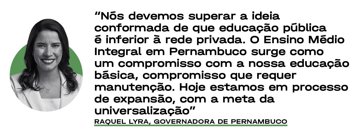 Ciente dos efeitos positivos, o governo de Pernambuco tem investido constantemente na expansão do ensino público integral. Hoje, o estado é o número 1 em adoção desse modelo no Brasil: o Censo Escolar de 2024* mostra que 71% das matrículas em escolas estaduais de ensino médio em Pernambuco são em Escolas de Referência. “Pernambuco lidera, há dois anos consecutivos, o ranking nacional de alunos matriculados no ensino médio em tempo integral”, diz Gilson Monteiro Filho, secretário de Educação do estado de Pernambuco. “A universalização do ensino integral que temos promovido estimula o protagonismo juvenil e o desenvolvimento do projeto de vida, tornando nossos jovens mais preparados para os desafios pessoais e profissionais.