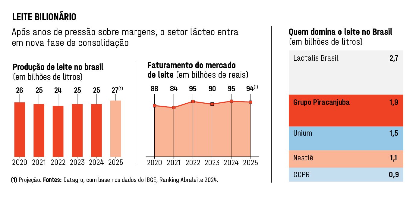 Há, porém, uma inflexão estrutural em curso. A produtividade média por vaca saltou de 4,5 para 7 litros em dez anos, avanço superior a 50%. A Datagro projeta que a captação formal atinja 27,4 bilhões de litros em 2025, estabelecendo um novo recorde. O crescimento é puxado por menos produtores, porém mais qualificados, e por uma matéria-prima mais rica em proteína e gordura.