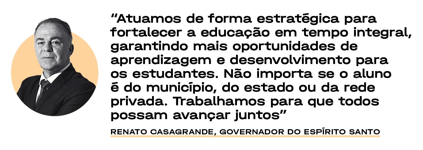 “Esse modelo amplia a jornada escolar, com foco no fortalecimento da aprendizagem e no acompanhamento individualizado, apoiando a construção do projeto de vida. Assim, asseguramos que os estudantes capixabas desenvolvam suas trajetórias educacionais com mais protagonismo, auto[1]nomia e oportunidades para o futuro”, diz Vitor de Angelo, secretário de Educação do estado do Espírito Santo.