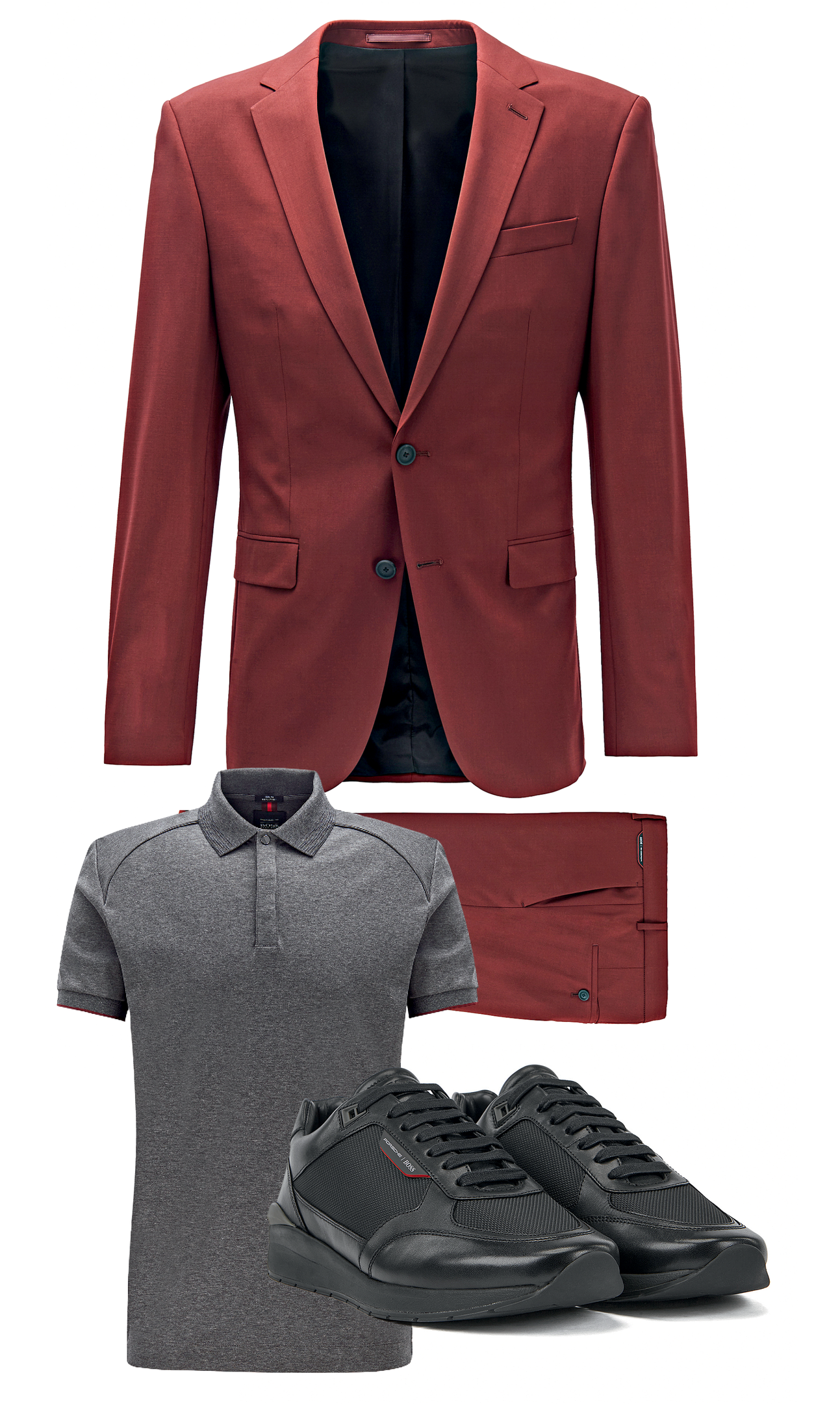 Um costume vermelho de lã fria de dois botões leva as linhas das curvas da Porsche nas costuras; e as camisas polo, as malhas e a jaqueta bomber feita com material ultraleve têm costuras e acabamentos especiais com detalhes em vermelho que fazem alusão às novas lanternas traseiras dos modelos atuais da Porsche.