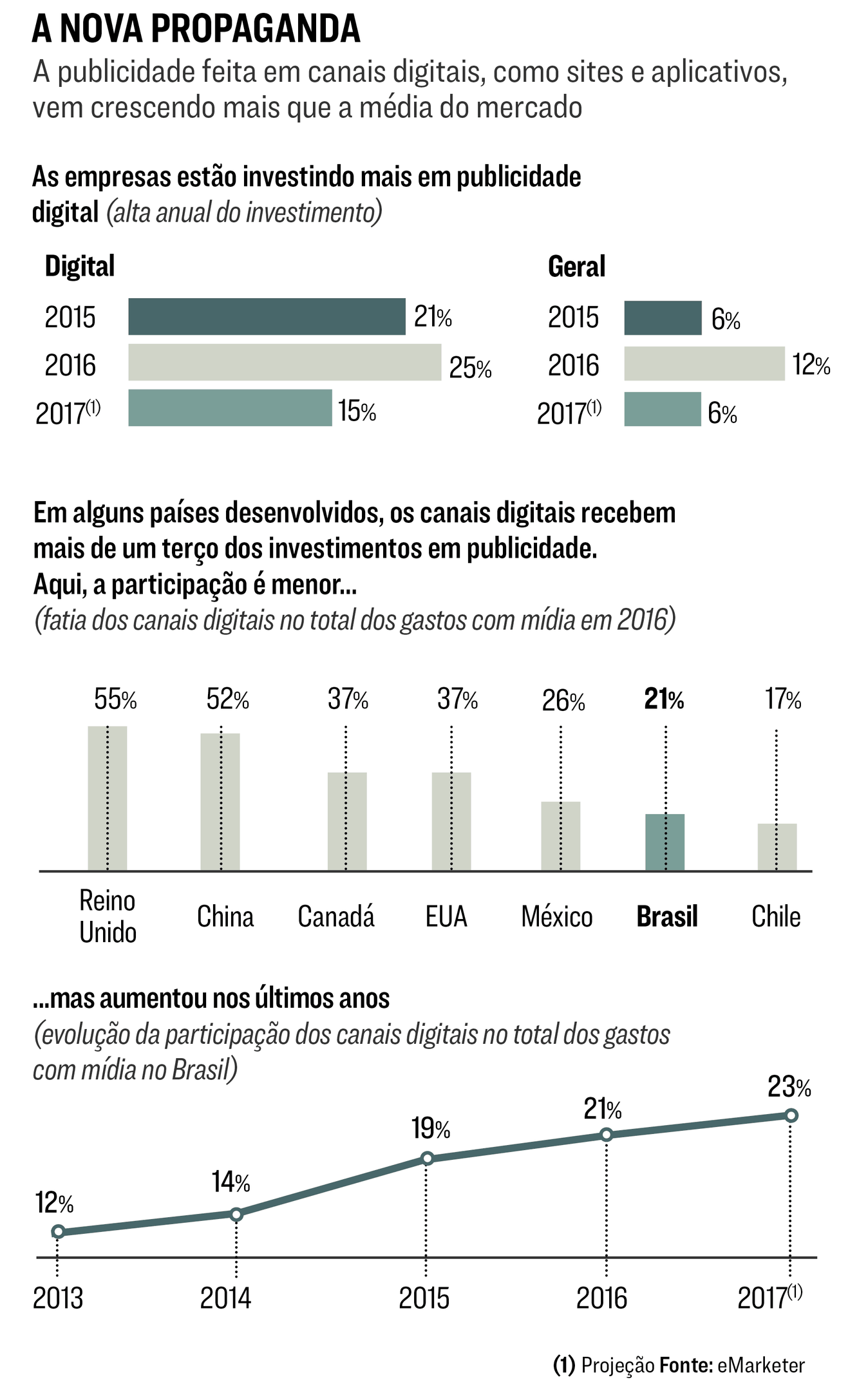 As pequenas e médias empresas também vêm investindo mais em publicidade digital, e há startups voltadas exclusivamente para atender esse segmento. A catarinense Resultados Digitais oferece consultoria para deixar sites mais bem posicionados nas buscas do Google e assessoria de comunicação para aumentar a leitura das mensagens enviadas aos consumidores. Diz ter 6 000 clientes. Nos últimos anos, captou 85 milhões de reais com fundos brasileiros e estrangeiros para expandir a equipe. Outra empresa de Santa Catarina, a SumOne, organiza campanhas digitais para empresas que querem aumentar o fluxo de clientes em suas lojas em shoppings e ruas — como colocar cupons de desconto no Facebook ou enviá-los por e-mail. Entre os principais clientes estão franquias das redes de alimentação Subway, Spoleto e Domino’s Pizza. Quando o mercado de publicidade digital começou a se desenvolver, há cerca de dez anos, as campanhas eram voltadas quase exclusivamente para o público de internet — ou seja, falavam sobre sites de comércio eletrônico e produtos e serviços vendidos apenas no universo digital. Hoje, essa divisão sumiu. “O objetivo é chegar ao consumidor e convencê-lo a comprar”, diz Gabriel Rossi, consultor de marketing e professor na faculdade ESPM. Onde quer que ele esteja.