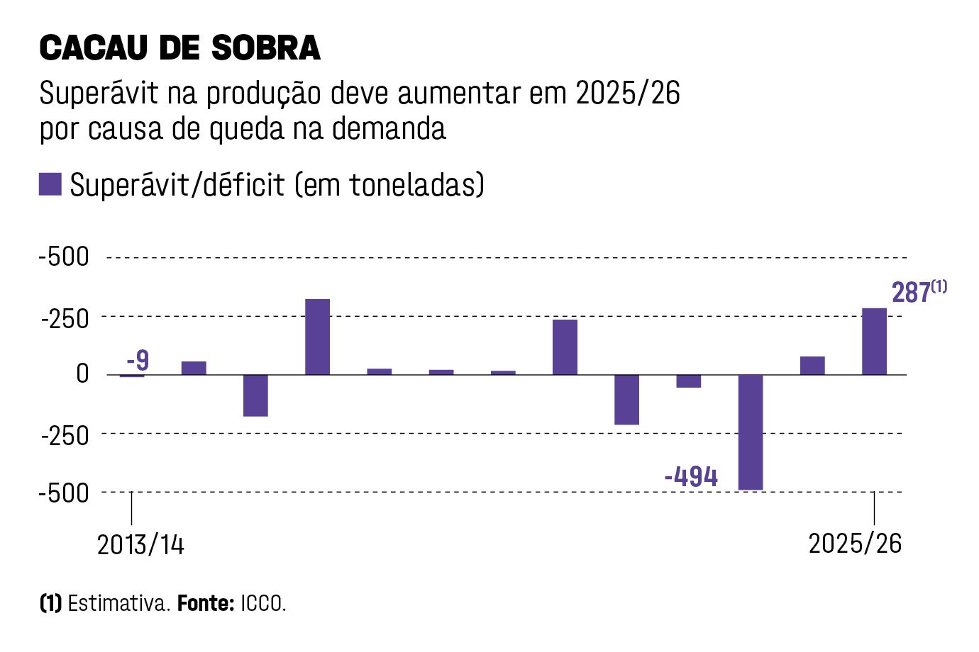As projeções para a safra global de cacau 2025/26 são alvissareiras. Se confirmadas, a commodity deve registrar um excedente de 287.000 toneladas, que representam 5,7% da produção global, estima o Itaú BBA, braço de agro do banco, com dados do Organização Internacional do Cacau (ICO).