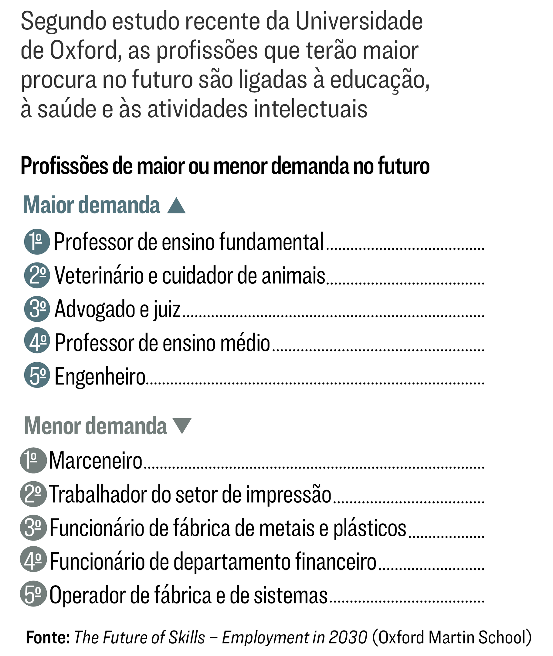 O resultado é que, embora 18% dos trabalhadores americanos hoje estejam empregados em profissões que tendem a perder espaço até 2030, outros 9% estão em áreas que deverão atrair cada vez mais pessoas. São profissões ligadas a educação, saúde, cuidados com animais ou que exigem habilidades de raciocínio e comunicação interpessoal. Já os empregos com funções repetitivas tendem a diminuir. É possível que nem todos os profissionais se adaptem, mas os pesquisadores acreditam que poderá ser feita uma transição para um mercado de trabalho ligado ao conhecimento.