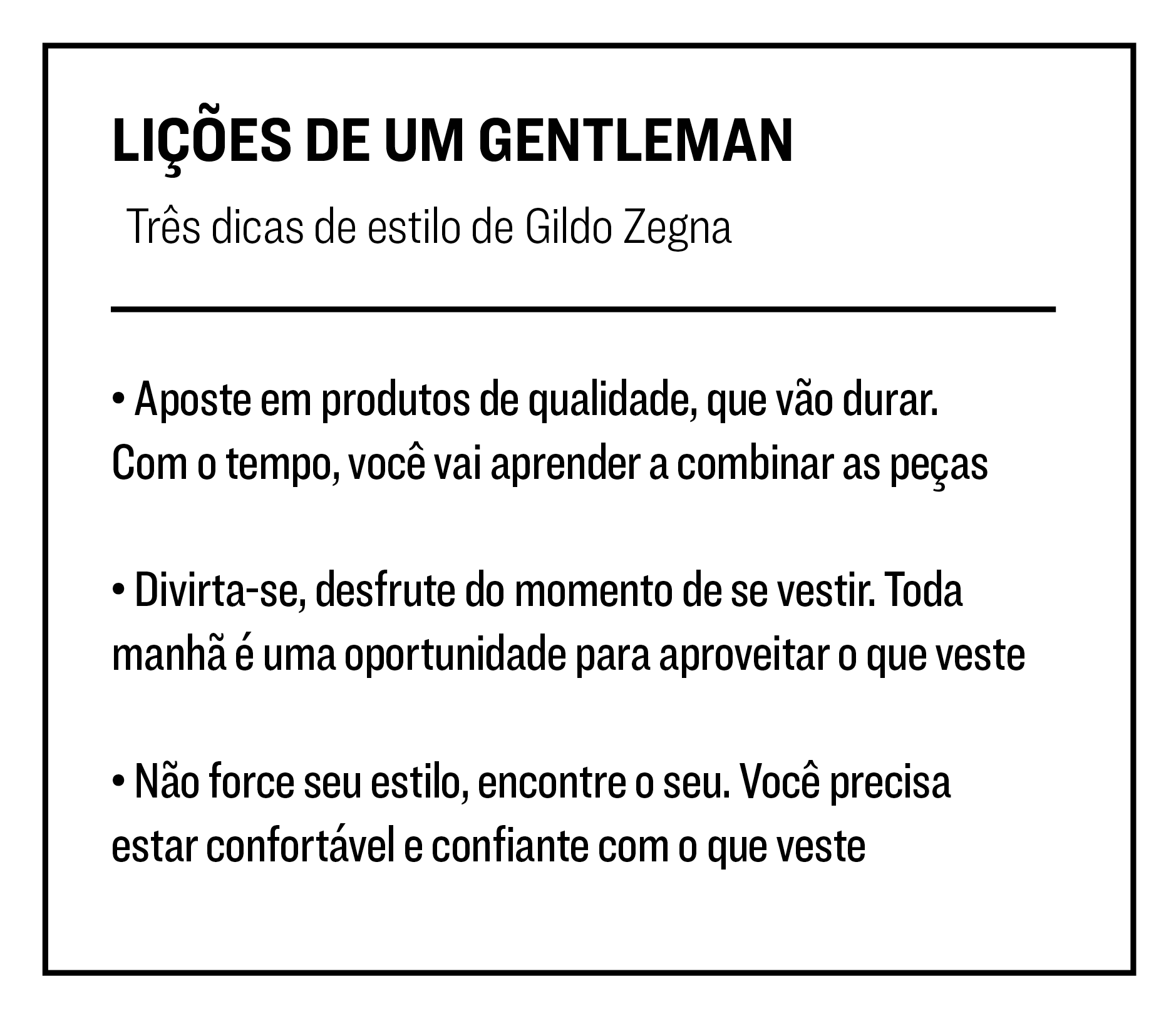 No dia seguinte à nossa conversa, Gildo Zegna participou da mesa de abertura do Iguatemi Talks, uma série de conferências sobre moda realizada pela rede de shopping centers, em São Paulo. Chega o momento das perguntas da plateia, e uma jornalista dispara: “Você fala muito da preocupação com os novos clientes, mas como está se preparando para a geração Z [aqueles nascidos do fim dos anos 90 para cá]?” Ao que Gildo responde, entre risadas: “Calma, calma. É muito cedo para falar neles. Ainda estamos tentando consertar os millennials”.