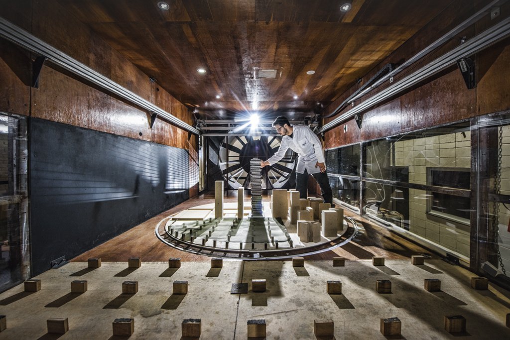 Visto de fora, o túnel de vento se assemelha a uma grande filmadora, dividida em duas partes. A primeira seria uma lente em forma de funil que abriga um ventilador com dez hélices. A outra parte é o corpo da máquina revestido de madeira. Em seu interior, há dezenas de pequenos blocos de madeira com alturas variáveis e que representam prédios, casas e lojas. É nessa maquete que é testada a força do vento em diferentes situações. Durante uma visita da reportagem de EXAME, os testes simulavam as condições que um novo edifício, a ser construído pelas incorporadoras City e OM, em Goiânia, enfrentará na vida real. A torre terá 45 andares, com 170 metros de altura, e será o prédio mais alto da capital goiana.