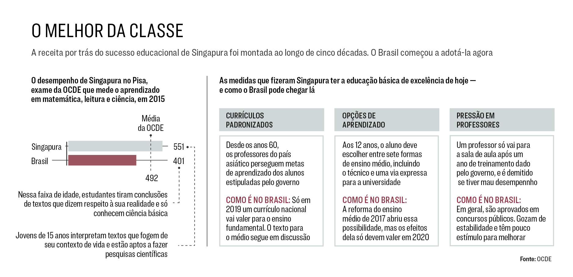 Em 2015, edição mais recente do Pisa, a nota dos estudantes de Singapura foi 12% acima da média da OCDE e 37% superior à brasileira. Nessa faixa etária, os alunos do país asiático dão conta de resolver problemas matemáticos complexos e de interpretar textos com realidades distintas das suas. São habilidades bem superiores às dos estudantes do Brasil, onde ainda é comum ver jovens semi-alfabetizados aos 15 anos, apesar da ênfase teórica dos currículos por aqui. Prestar atenção no que funciona em Singapura pode ajudar a tirar o ensino brasileiro do atoleiro. A boa notícia é que o Brasil já dá os primeiros passos em direção ao que deu certo por lá.
