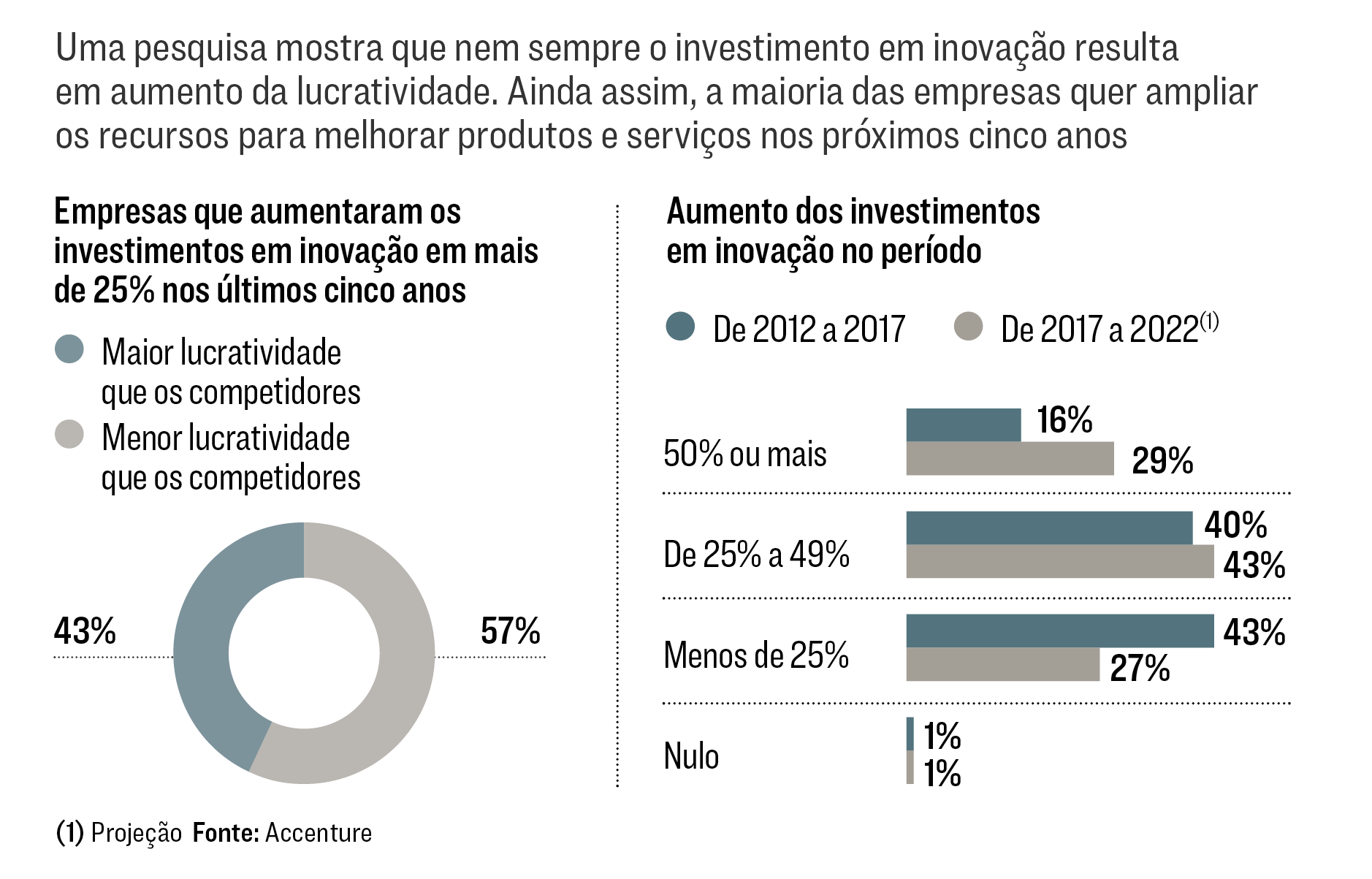 Empresas de todo o mundo injetaram 3,2 trilhões de dólares em inovação e pesquisa nos últimos cinco anos, mas o retorno sobre os investimentos caiu 27% no período. Um estudo da consultoria americana Accenture aponta que 57% das companhias que aumentaram em 25% os aportes em inovação tiveram desempenho pior do que o de seus pares.