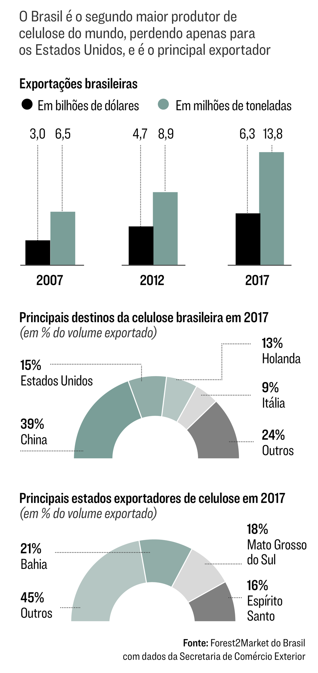 As fabricantes de celulose brasileiras têm aproveitado a valorização do dólar e o maior número de pedidos vindos da China, dos Estados Unidos e da Europa para exportar mais. Na última década, o total exportado cresceu 8% ao ano tanto em volume quanto em receita. “Os preços devem subir novamente em 2019”, diz Marcelo Schmid, diretor da consultoria Forest2Maket do Brasil, que acompanha o setor. Isso porque a demanda deve continuar crescendo sem que a oferta consiga acompanhar o ritmo. “Concorrentes, como Canadá e Indonésia, não têm como suprir a nova demanda, e isso deve levar o Brasil a disparar na frente dos demais exportadores.” O país já é o maior exportador do mundo, mas ainda perde para os Estados Unidos em termos de produção de celulose.