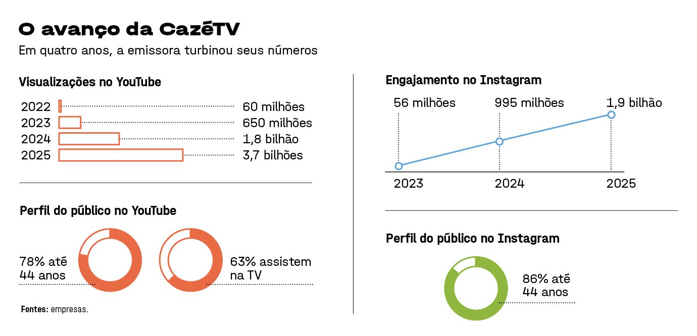 De 2022 para cá, o improviso deu origem a um negócio bilionário. A CazéTV transmite campeonatos como o Italiano, o Francês e o Alemão, assim como o Brasileirão, o Paulista, e uma infinidade de esportes olímpicos.