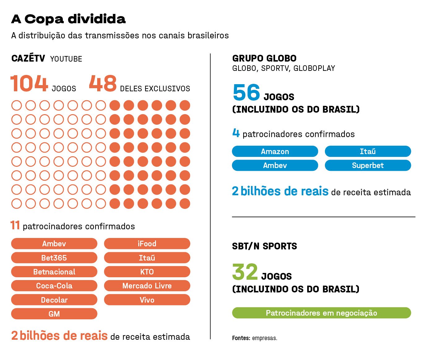 É uma mudança tectônica no mercado brasileiro e, até aqui, o maior case global de sucesso nas transmissões esportivas online. Juntos, CazéTV e YouTube já negociaram 11 cotas de patrocínio para o mundial, com receita estimada em R$ 2 bilhões.