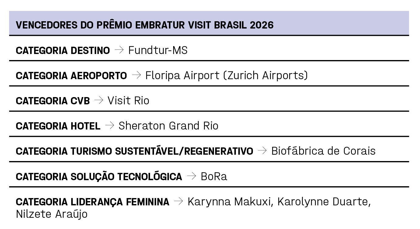 A cerimônia para a entrega do prêmio, realizada em Brasília como parte da agenda do Visit Brasil Summit 2026, reuniu autoridades, executivos e representantes do trade turístico. Entre os destaques, o Rio de Janeiro conquistou o primeiro lugar em duas categorias: em Conventions & Visitors Bureau, com o Visit Rio, e em Hotelaria, com o Sheraton Grand Rio. O Floripa Airport, operado pela Zurich Airport Brasil, ganhou na categoria Aeroporto. Já o trabalho da Fundação de Turismo de Mato Grosso do Sul (Fundtur-MS) fez o estado ser considerado o destino que mais se destaca na promoção da imagem do Brasil no exterior.