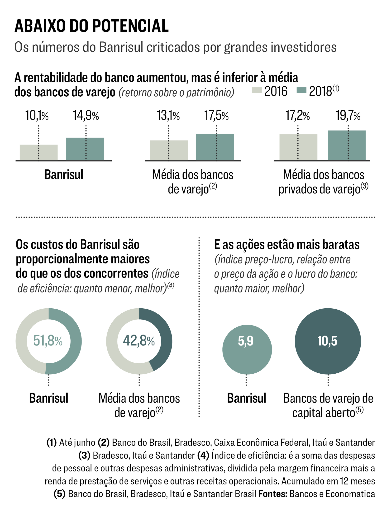 Os resultados melhoraram nos últimos dois anos — a rentabilidade sobre o patrimônio, por exemplo, passou de 10%, em 2016, para quase 15% agora. Mas os números são piores do que os dos principais bancos de varejo, com os quais o Banrisul se compara. A grande diferença está no nível de despesas. O índice de eficiência, que mede a relação entre os gastos administrativos e com pessoal e um conjunto de receitas, é de 52% no Banrisul. Quanto menor o índice, melhor. Todos os demais bancos de varejo têm indicadores mais baixos: a média de Banco do Brasil, Bradesco, Caixa, Itaú e Santander é de 43%.