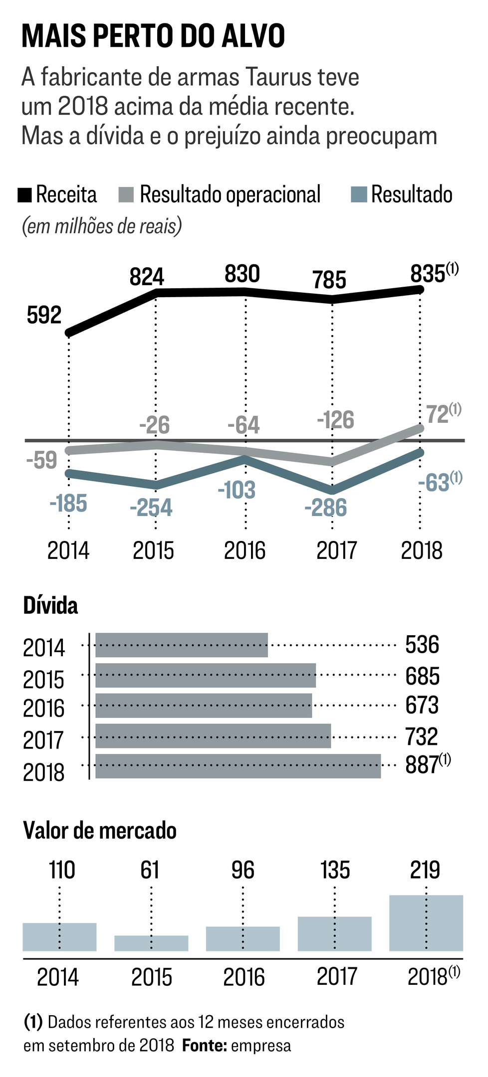 Os problemas aos quais Nuhs dedica sua atenção, na verdade, poderiam ser encontrados em companhias dos mais variados setores. A Taurus tenta se recuperar após anos de produção desorganizada, bagunça nas contas e denúncias de falhas nos produtos. E acumula prejuízo de quase 900 milhões de reais nos últimos cinco anos. Tudo isso atuando numa condição de virtual monopólio na fabricação e na venda de armas no Brasil — pelo menos até agora.