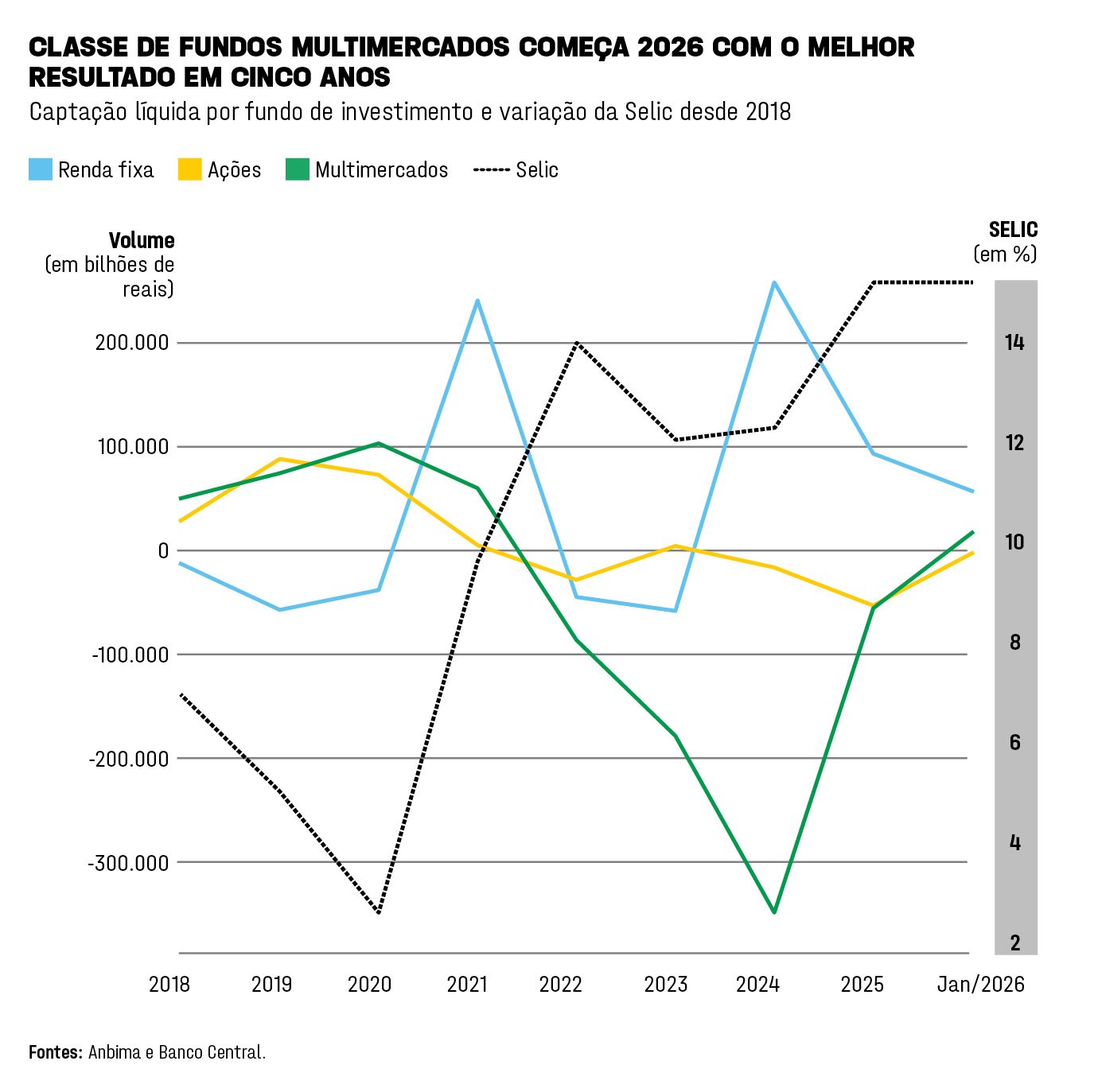 Em 2024, os fundos multimercados bateram recorde de resgates e perderam 349,1 bilhões de reais. Um ano depois, as saídas desaceleraram, mas ainda assim tiveram uma soma expressiva, de 58,9 bilhões. A renda fixa vem drenando uma boa parte desses recursos e captou 84,3 bilhões de reais en 2025, embalada por uma Selic de 15% ao ano, a maior desde 2006.