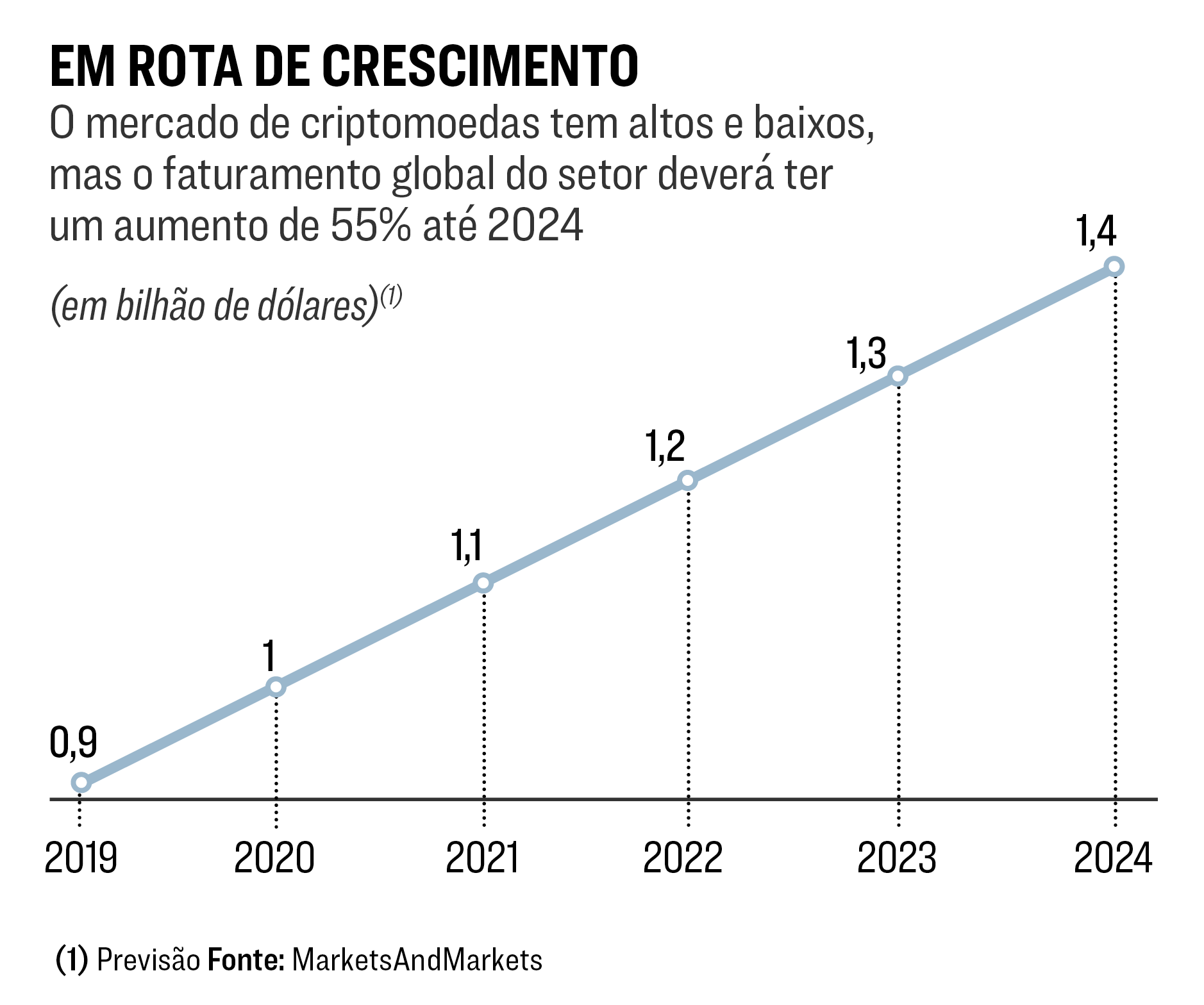 O mercado mundial de criptomoedas — como são chamadas as moedas digitais que usam criptografia, como o bitcoin e a libra — só tende a crescer. Segundo a consultoria americana MarketsAndMarkets, o faturamento do setor deverá passar de 900 milhões de dólares, em 2019, para 1,4 bilhão, em 2024, um crescimento de 55%. Para Tatiana Revoredo, professora na escola de negócios Insper, de São Paulo, e fundadora de uma consultoria especializada no tema, um dos entraves do dinheiro digital é a velocidade de validação das transações. “Enquanto o bitcoin faz sete transações por segundo, o ethereum, segunda criptomoeda mais popular, faz 15. Quem vencerá nesse mercado é a empresa que resolver o problema do uso em grande escala”, diz.