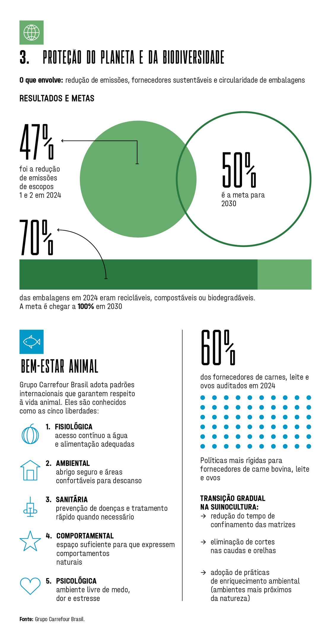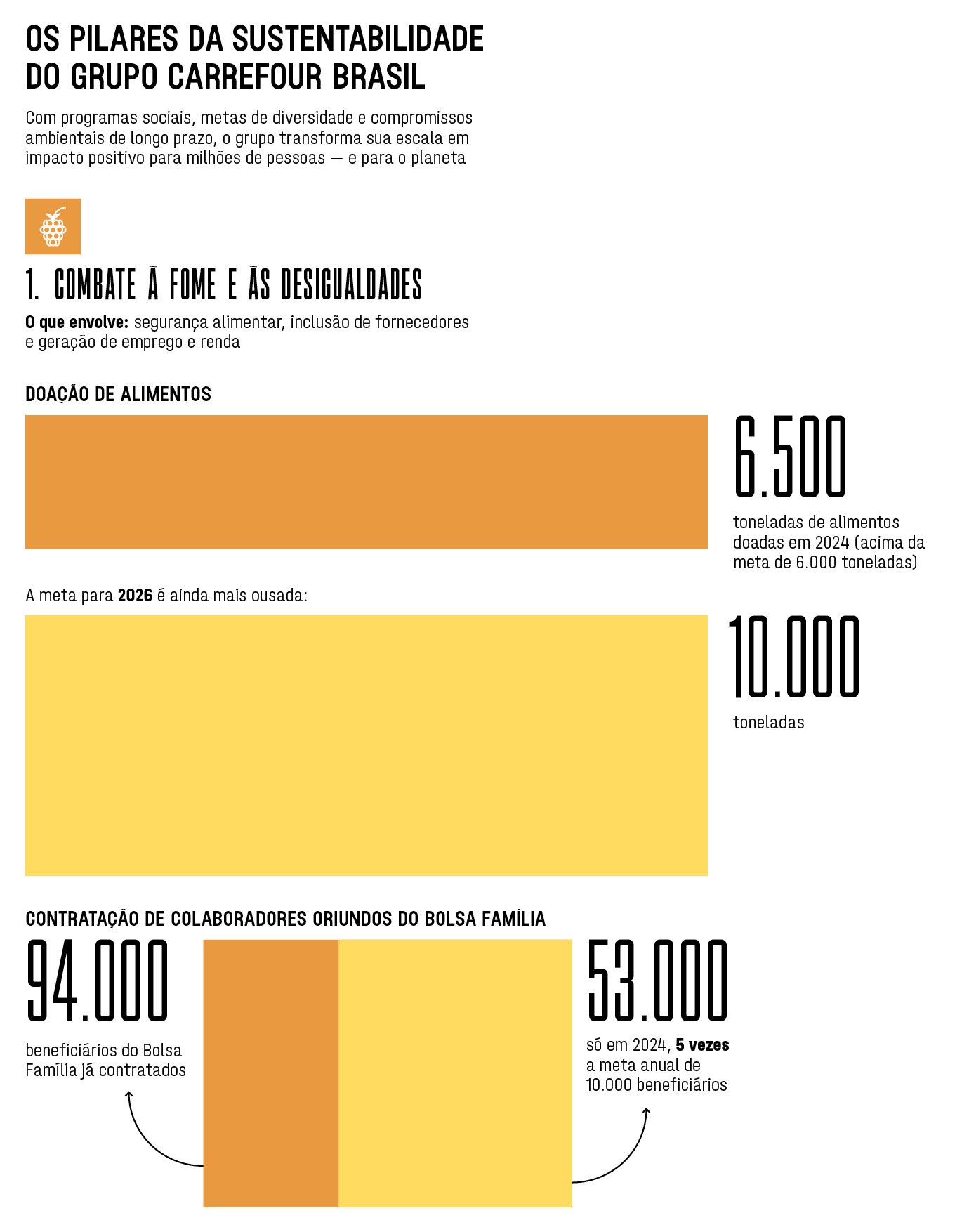 O Grupo Carrefour Brasil segue os compromissos globais, mas também se adapta aos contextos e às prioridades locais. Assim, aqui no Brasil a estratégia de sustentabilidade parte de três pilares: o primeiro é o Combate à Fome e às Desigualdades, o que inclui iniciativas na área de segurança alimentar, o desenvolvimento e a inclusão de pequenos fornecedores na cadeia de valor da empresa e a geração de emprego e de renda. O segundo é a Inclusão e Diversidade, definidas pelo combate ao racismo e pela promoção da equidade de gênero, pela inclusão de pessoas com deficiência nos quadros da empresa e pela educação e cultura de forma inclusiva. O último é a Proteção do Planeta e da Biodiversidade, o que envolve os compromissos da agenda climática, o fomento de uma cadeia de fornecimento sustentável e a circularidade, como redução de embalagens e combate ao desperdício de alimentos.