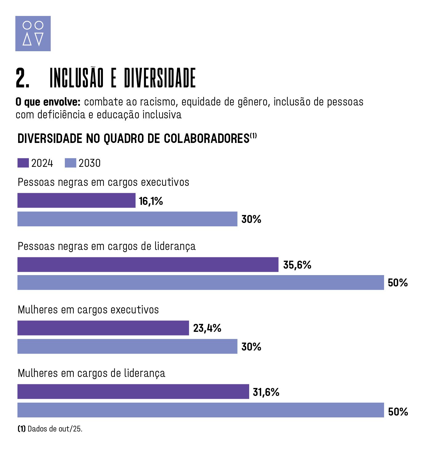 As metas do Grupo Carrefour Brasil para o pilar estratégico relacionado à inclusão e à diversidade são ousadas. Até 2030, a empresa espera ter pelo menos 30% dos cargos executivos ocupados por mulheres e outros 30% por pessoas negras. Para os cargos de liderança, o objetivo, estabelecido há cinco anos, é de 50% para cada um dos grupos. Em 2024, o Grupo Carrefour Brasil fechou com 14% de pessoas negras e cerca de 22% de mulheres em posições executivas. Nos cargos de liderança, a ocupação era de cerca de 33% de mulheres e 35% de pessoas negras. Para esses números continuarem avançando, a empresa investe em formação. Um dos programas chama-se P.O.D.E.R., direcionado a colaboradores negros e negras para desenvolvimento pessoal e profissional, empoderamento e crescimento na carreira. No ano passado, 527 pessoas passaram por esse curso. Os melhores alunos tiveram a oportunidade de fazer mentorias com líderes negros e negras tanto de dentro quanto de fora do grupo. “O programa é uma forma de reconhecer e impulsionar talentos, garantindo que tenham acesso às mesmas oportunidades de crescimento e liderança”, afirma Susy Yoshimura, diretora sênior de Sustentabilidade do Grupo Carrefour Brasil.