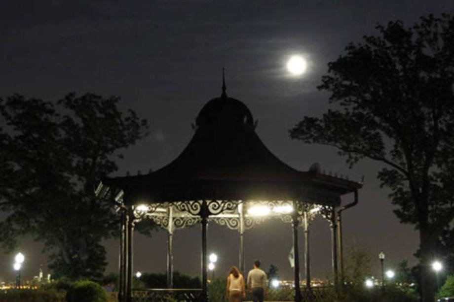 A reserva Eagle Rock fica localizada no estado de Nova Jersey. A imagem mostra pessoas em observando a superlua em um coreto.