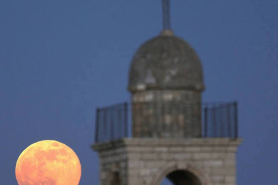 Nesta imagem registrada em Jerusalém, a superlua aparece ao lado do monastério ortodoxo grego Mar Elias.