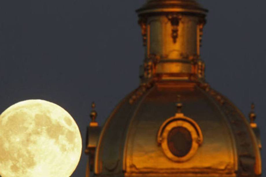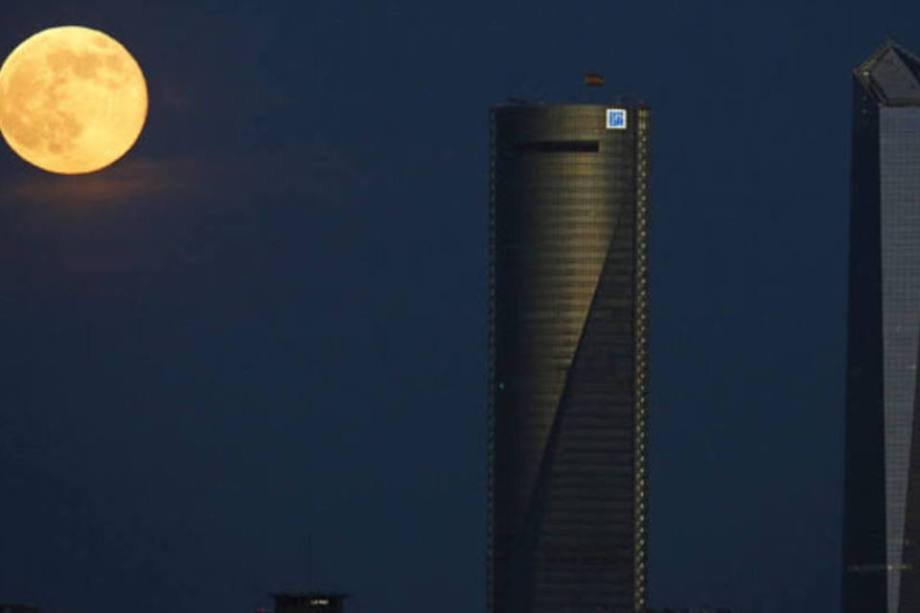 Aqui, a superlua é vista no céu sobre o complexo financeiro da capital espanhola, o chamado Cuatro Torres Business Area, que conta com os maiores arranha-céus do país.