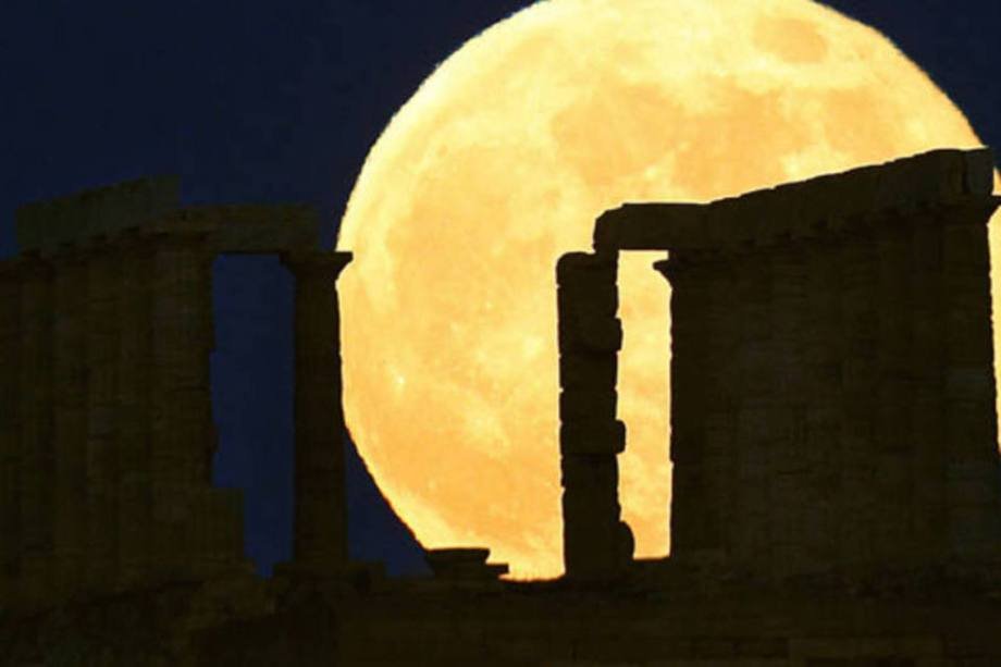 A 60 km de Atenas, a superlua foi fotografada próxima ao Templo de Poseidon, deus grego do mar.