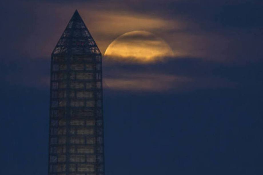 Capturada pela NASA, agência espacial americana, a imagem mostra a superlua próxima ao Monumento a Washington, ponto turístico da capital dos EUA.