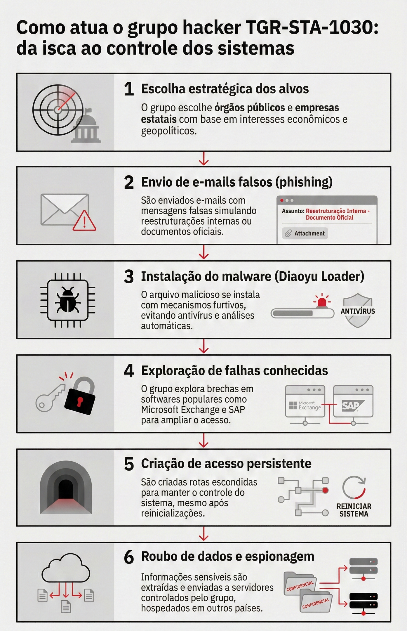 A ofensiva combinou campanhas sofisticadas de phishing com a exploração de falhas conhecidas em softwares corporativos amplamente utilizados por governos, como Microsoft Exchange e SAP. Entre as vítimas globais estão ministérios da Fazenda, Relações Exteriores, Energia, Comércio e até o parlamento de um país, cujo nome não foi divulgado.