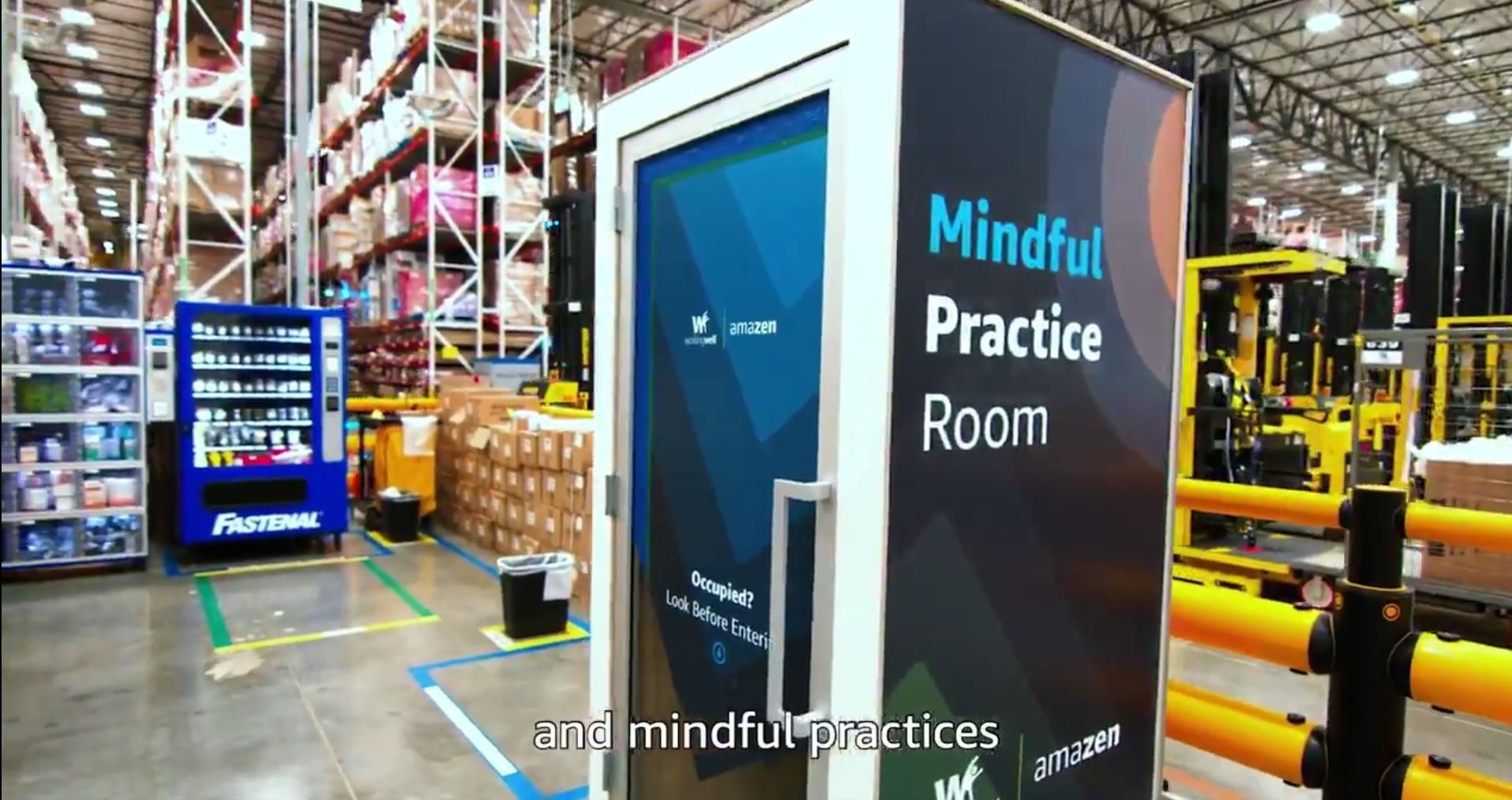 O espaço faz parte do programa WorkingWell, recentemente lançado da Amazon, que visa fornecer aos funcionários cansados “atividades físicas e mentais, exercícios de bem-estar e alimentação saudável ”com o objetivo de “ajudá-los a recarregar e reenergizar”, de acordo com um comunicado da empresa. Na minúscula sala, "quiosques interativos individuais" exibem vídeos de "meditações guiadas, afirmações positivas, cenas calmantes com sons e muito mais".