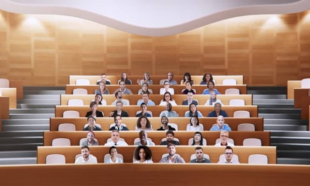 Entre as novas ferramentas do software Teams está uma em que os participantes de uma videoconferência são dispostos lado a lado, em cadeiras brancas, como num auditório.