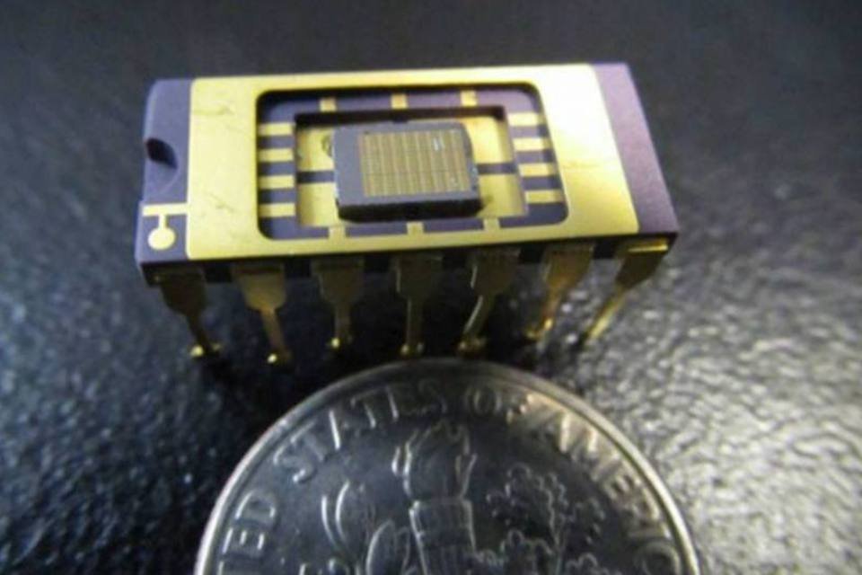 Um único chip contém centenas de LEDs integrados; o dispositivo é menor do que uma moeda (Jan Petykiewicz / Stanford School of Engineering)