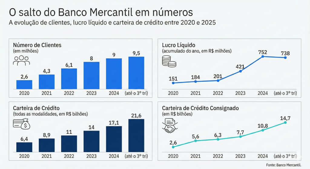 O Mercantil completou seu 12º trimestre consecutivo de lucro recorde, somando R$ 254 milhões no terceiro trimestre de 2025, enquanto a carteira de crédito avançava 31% e atingia R$ 21,6 bilhões. O consignado, carro-chefe histórico da instituição, cresceu 44% em 12 meses e chegou a R$ 14,7 bilhões, impulsionado por uma originação que somou R$ 4,4 bilhões, com 85% dela feita por canais digitais.