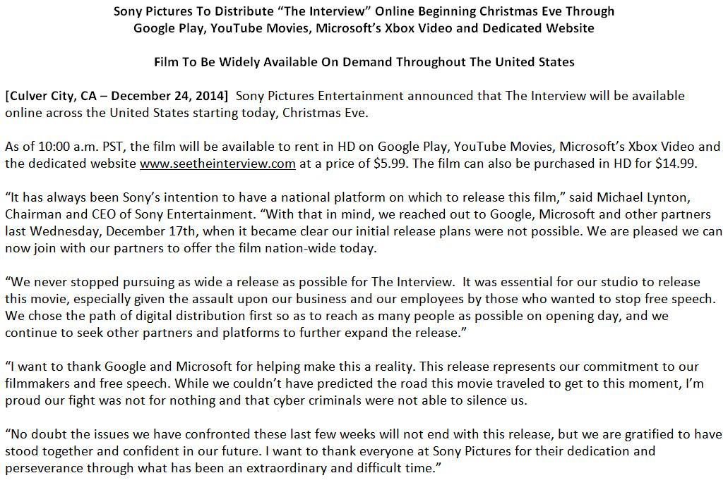 Os hackers ainda ameaçaram realizar ataques terroristas em cinemas que exibissem especificamente A Entrevista, o que forçou o estúdio a cancelar o lançamento do filme. A medida não foi muito bem vista por Hollywood e nem pelo presidente norte-americano Barack Obama, o que parece ter influenciado essa volta atrás feita pela empresa.