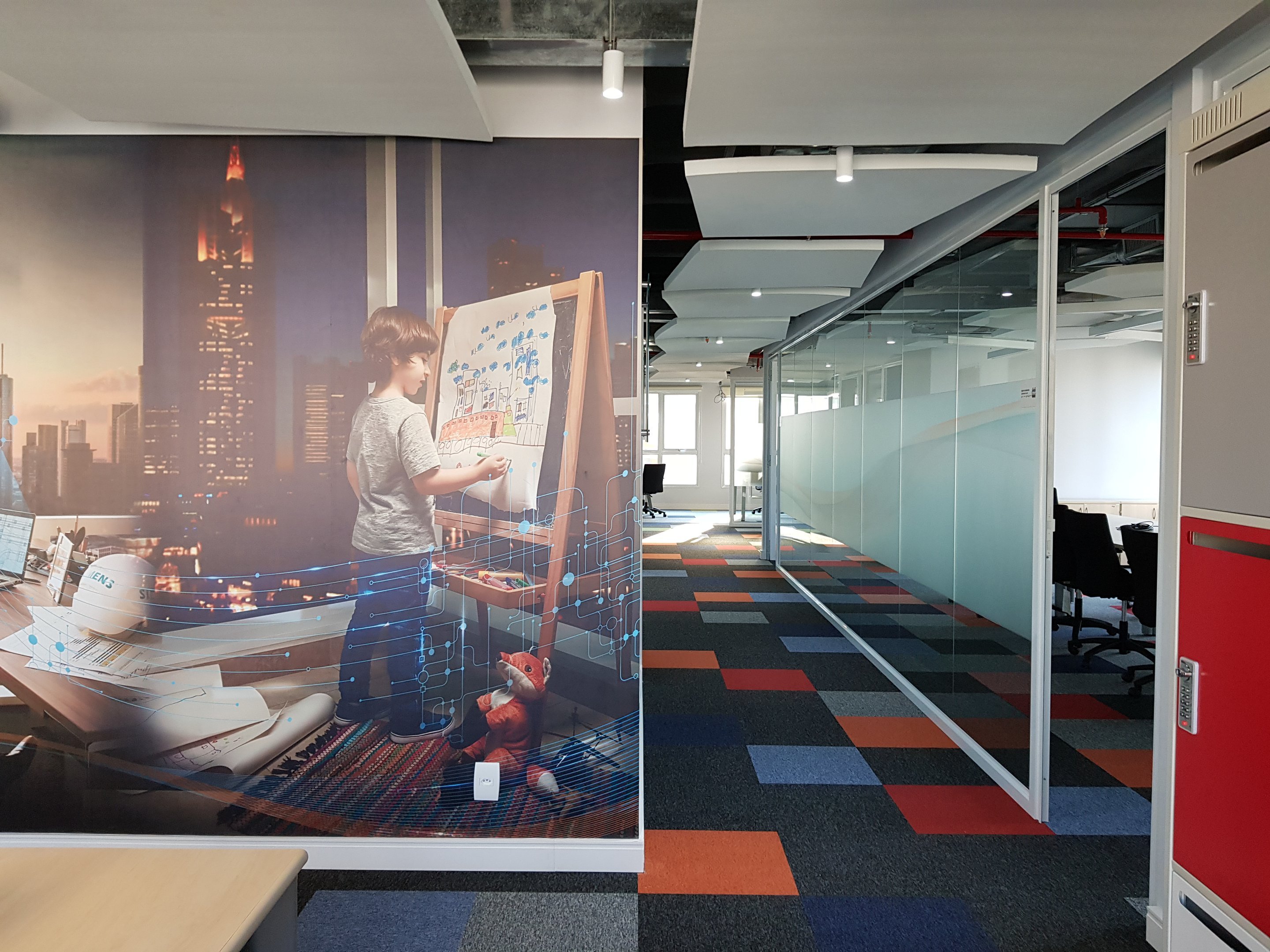 O escritório foi concebido sob o conceito de Smart Office, ou seja, há espaços para a colaboração de funcionários, o que deixa o ambiente de trabalho mais flexível do que os tradicionais com lugares fixos para cada pessoa.